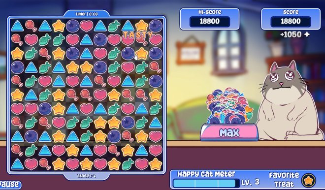 Help the kitties chow down! Three or more tiles put a treat in the bowl, get enough treats, and the cat will happily move in with you! But keep tabs on the timer, as the clock continues to tick down. Don't want to disappoint the cats, do you?
