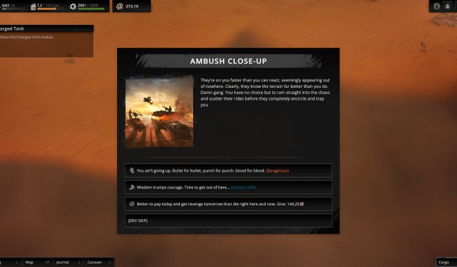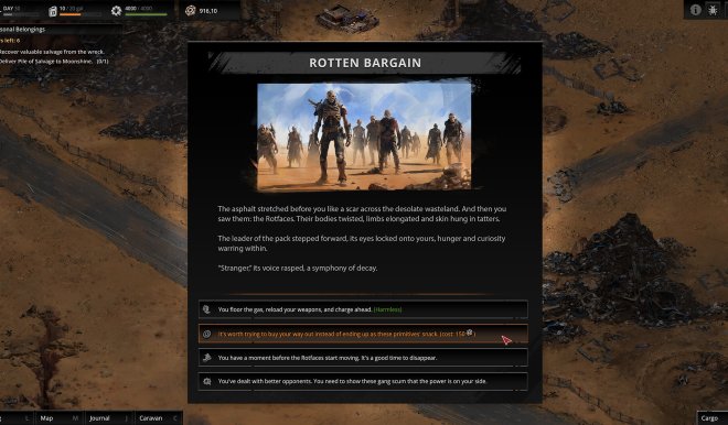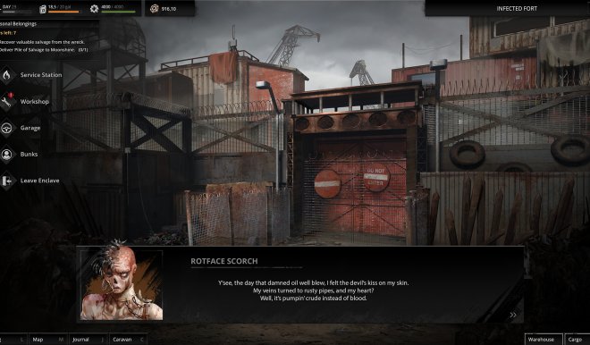 "一切都没有按计划进行。你早晚会失去对炼油厂的控制权。而且……这确实发生了。致命的“锯齿”发动袭击并夺走了你的一切。你的朋友维克多死了。燃料没了、设备没了、伙伴们都离开了。是时候用废品组装你的第一辆车,召集新团队成员,重新回到正轨。抓紧时间,因为“大风暴”就要来了。