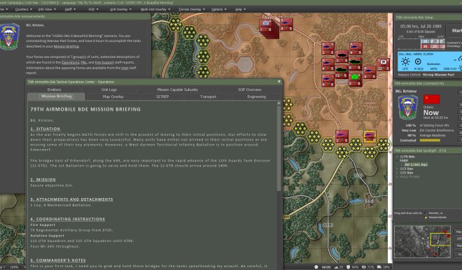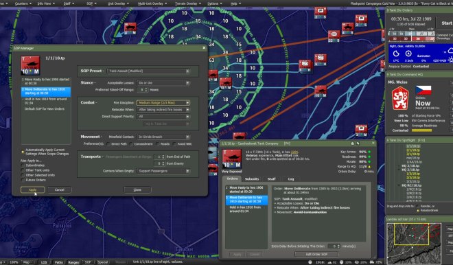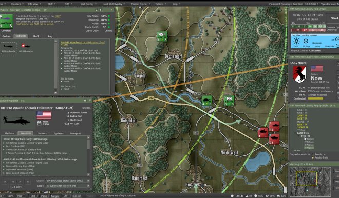 Flashpoint Campaigns: Cold War is a deep simulation of combat operations where forces are arranged in maneuver units of companies, platoons, and sections of tanks, infantry fighting vehicles, infantry squads and teams, recon forces, engineers, air-defense and anti-tank systems, helicopters, and more. As the Commander, the player must use available off-map assets like long-range artillery, rockets, or airstrikes as force multipliers in the battle space. The Commander may be faced with the specter of using chemical or nuclear weapons to support their forces on the map and win the day.