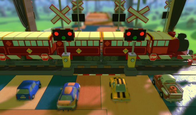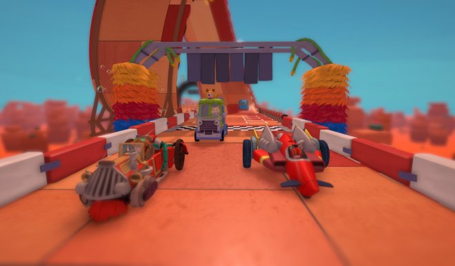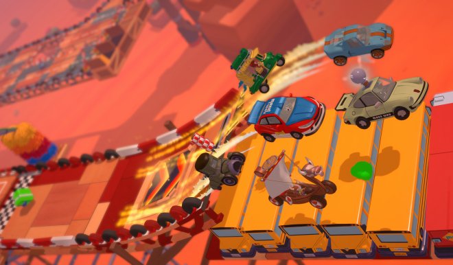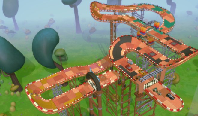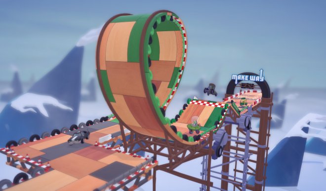 玩家可以同心协力或彼此为敌,使用各式各样的荒谬碎片快速搭建赛道,包括圆圈、跷跷板、螺旋形开瓶器,甚至铁路交汇道等碎片,然后再加入障碍物和强化。你可以用位置极佳的障碍物来破坏好友的比赛,或者用诡诈的加速垫将对手从弯道的一侧抛出去。