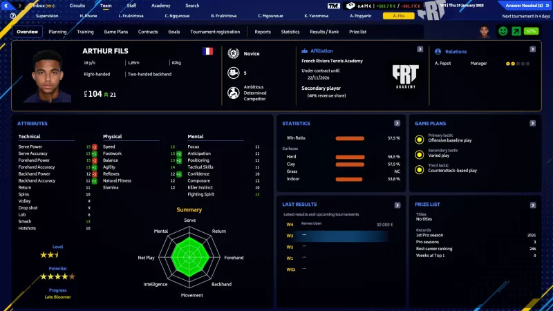 Put on your coach's suit and step into the exhilarating world of tennis management in TM23! Immerse yourself in the ultimate tennis simulation, where your decisions both on and off the court will shape the destiny of your academy. Be the number 1 manager and become a national Team Captain to lead your team to greatness!