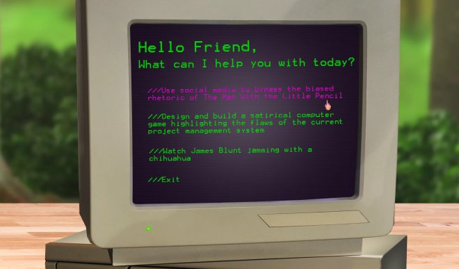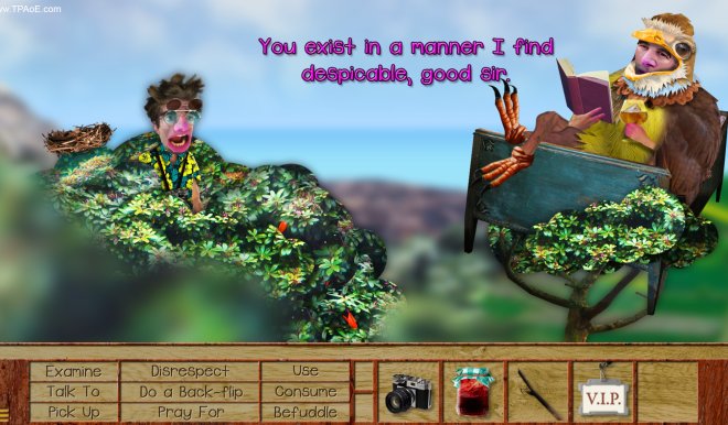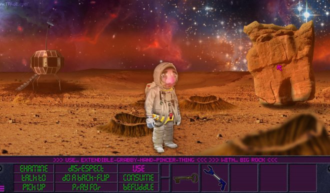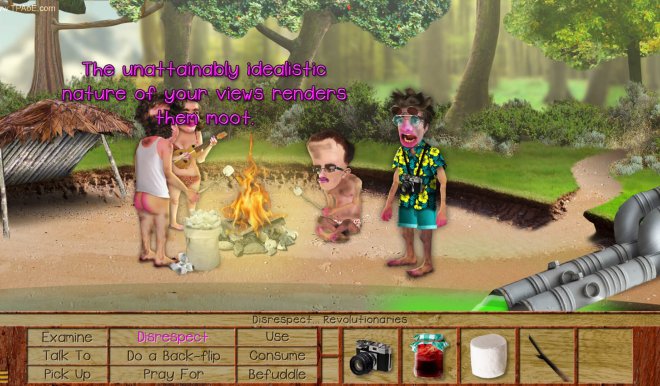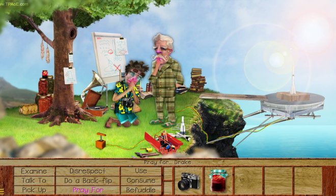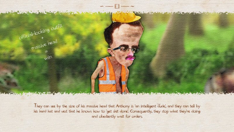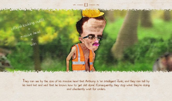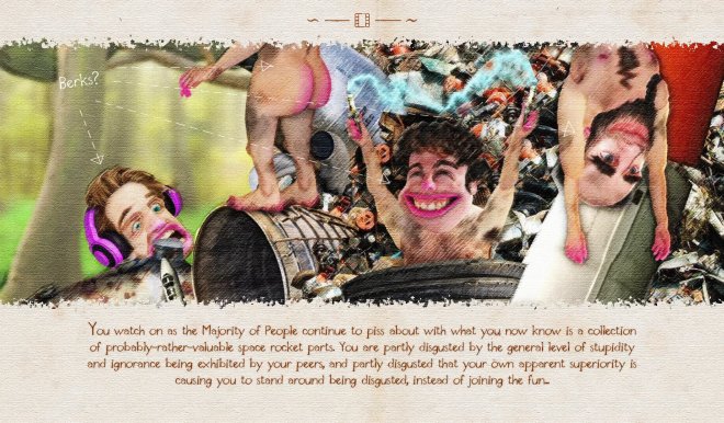《The Preposterous Awesomeness of Everything》的故事围绕一个看似原始的社会展开。这群人试图合力建造一艘靠胶水和胶带粘合的太空火箭。跟随“大多数人”的步伐从无序世界(过去),穿越到扭曲恶心又骇人荒诞的伪民主时代(这里暗指当代,我是在讽刺!你懂的吧?!?!),最终迈向虚无缥缈的外太空(未来)。