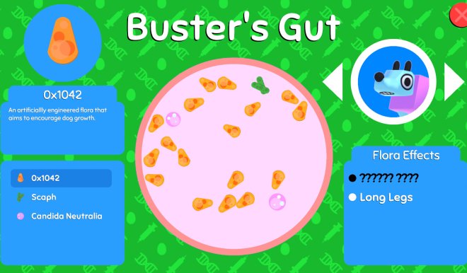 狗狗们的躯体受控于模拟基因系统,具有高度可变的特性。随着年龄增长,它们会阶段性地进入化蛹状态,身体也会发生变异。狗狗们所吃的食物会让它们的肠道充满不同的菌群,请参看上方的动图。这些菌群会对狗狗的变异产生影响,您可借此对它们进行精心塑造,从而打造出符合您想法的完美狗狗或不完美狗狗!